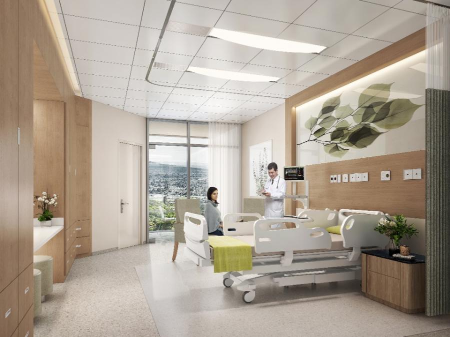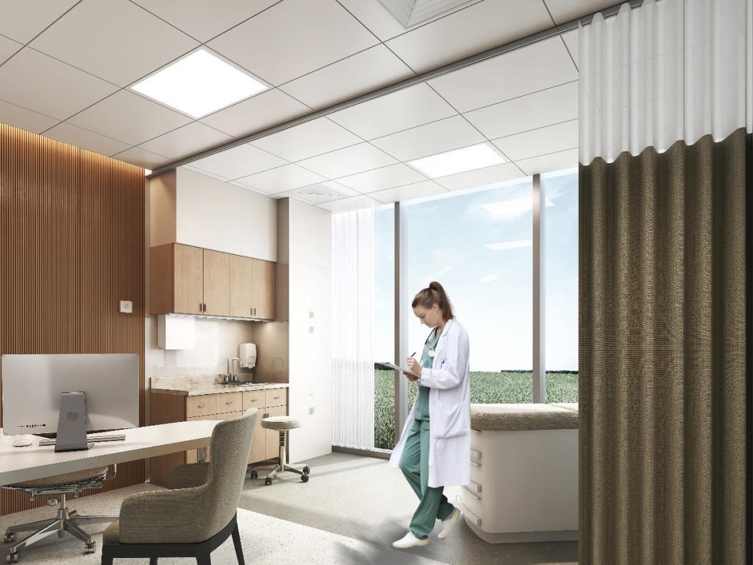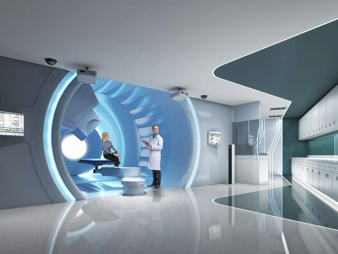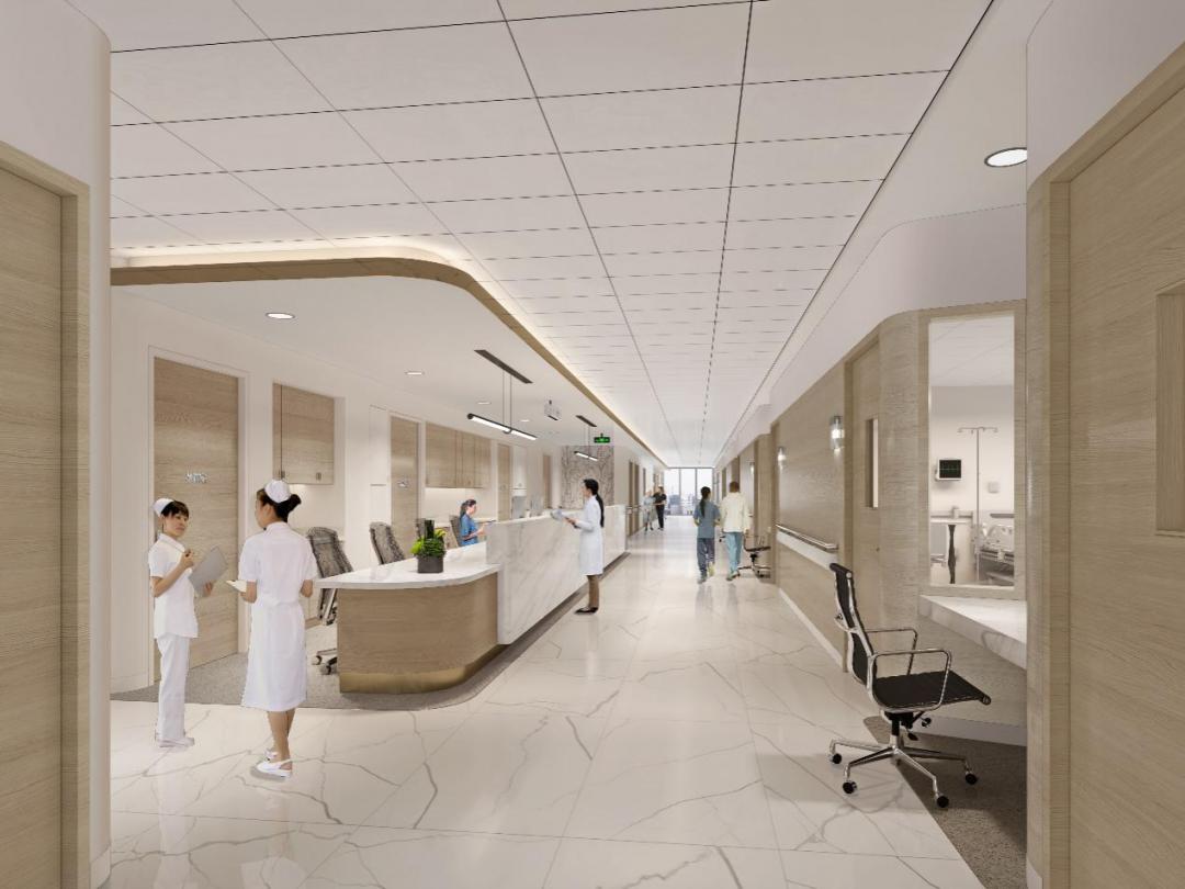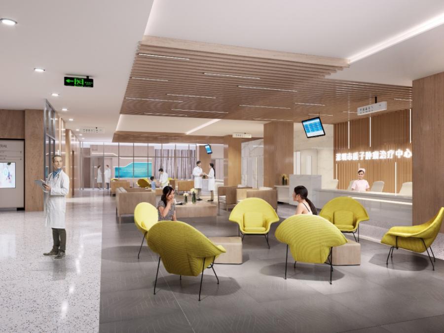 凸显质子治疗的高科技的同时,采用现代极简风格,大范围地运用木色、石材以及带有绿植图案的温馨自然的材质及颜色,营造一种温暖、充满自然气息以及人文关怀的医疗环境。