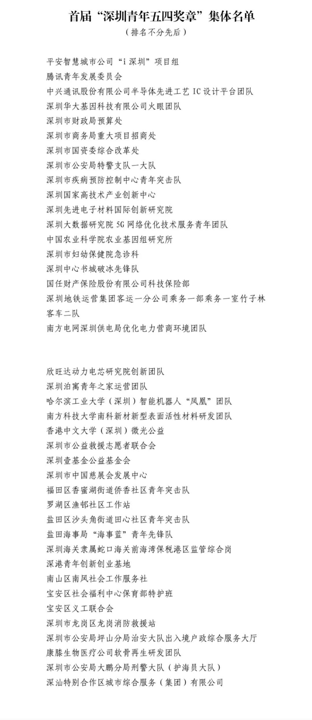 在五四青年节来临之际,共青团深圳市委员会、深圳市青年联合会共同颁授首届“深圳青年五四奖章”,表彰青年中的优秀典型和模范代表。决定授予于洋等80名同志首届“深圳青年五四奖章”个人,授予平安智慧城市公司“i深圳”项目组等40个青年集体首届“深圳青年五四奖章”集体。