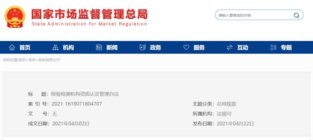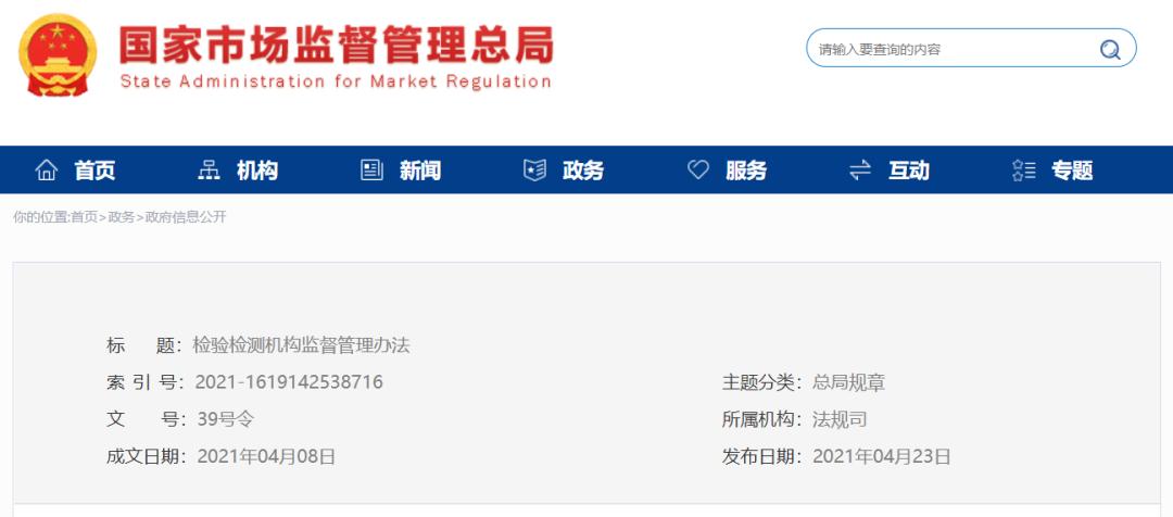 《检验检测机构监督管理办法》已经2021年3月25日国家市场监督管理总局第5次局务会议审议通过,现予公布,自2021年6月1日起施行。