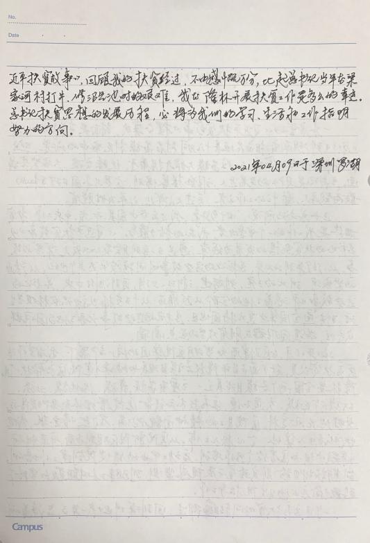 扶贫就是为老百姓谋幸福,就是在践行初心和使命。当读完《扶贫手记》后,罗湖区疾控中心党员刘卫民内心被深深地触动,他一字一句写下“读后颇为感动,加深了对扶贫工作的认识,中国脱贫攻坚是人类历史上最伟大的反贫困事业,是一条共产党领导下的富有中国特色的扶贫道路......作为专业技术人员,在公共卫生发展的道路上,在为人民谋幸福的征途中,勇于担当,负重前行,也一定能实现初心和使命。”