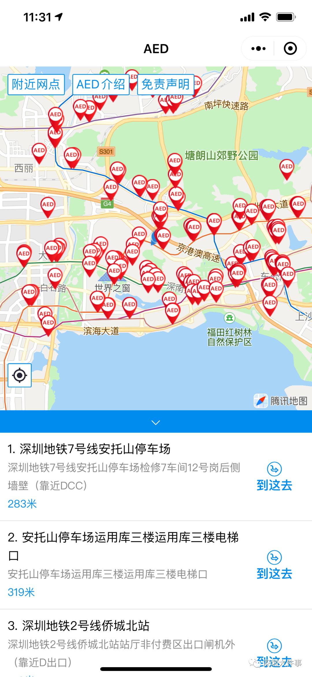 打开“腾讯地图”或者微信小程序,在搜索栏中输入“AED导航”就会显示离你最近的几台AED,根据导航提示即可前往取出。