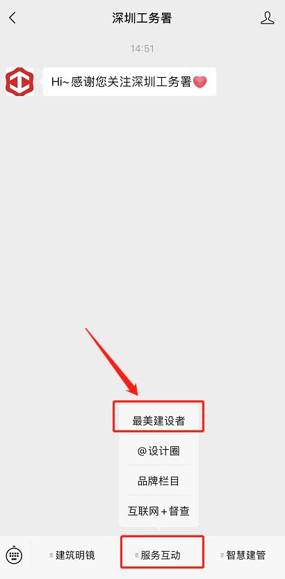❷关注“深圳工务署”官方微信公众号,在主菜单点击“服务互动”子栏目“最美建设者”就可以参与投票啦~