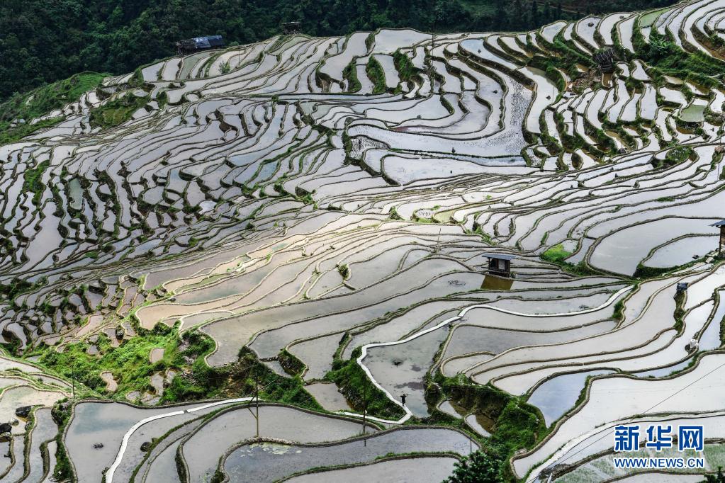 立夏前后,位于贵州省黔东南苗族侗族自治州从江县大山深处的加榜梯田蓄水丰盈、线条分明。青山环抱着梯田,苗寨点缀其间,在不同的光线下呈现出不同色彩,如诗如画。