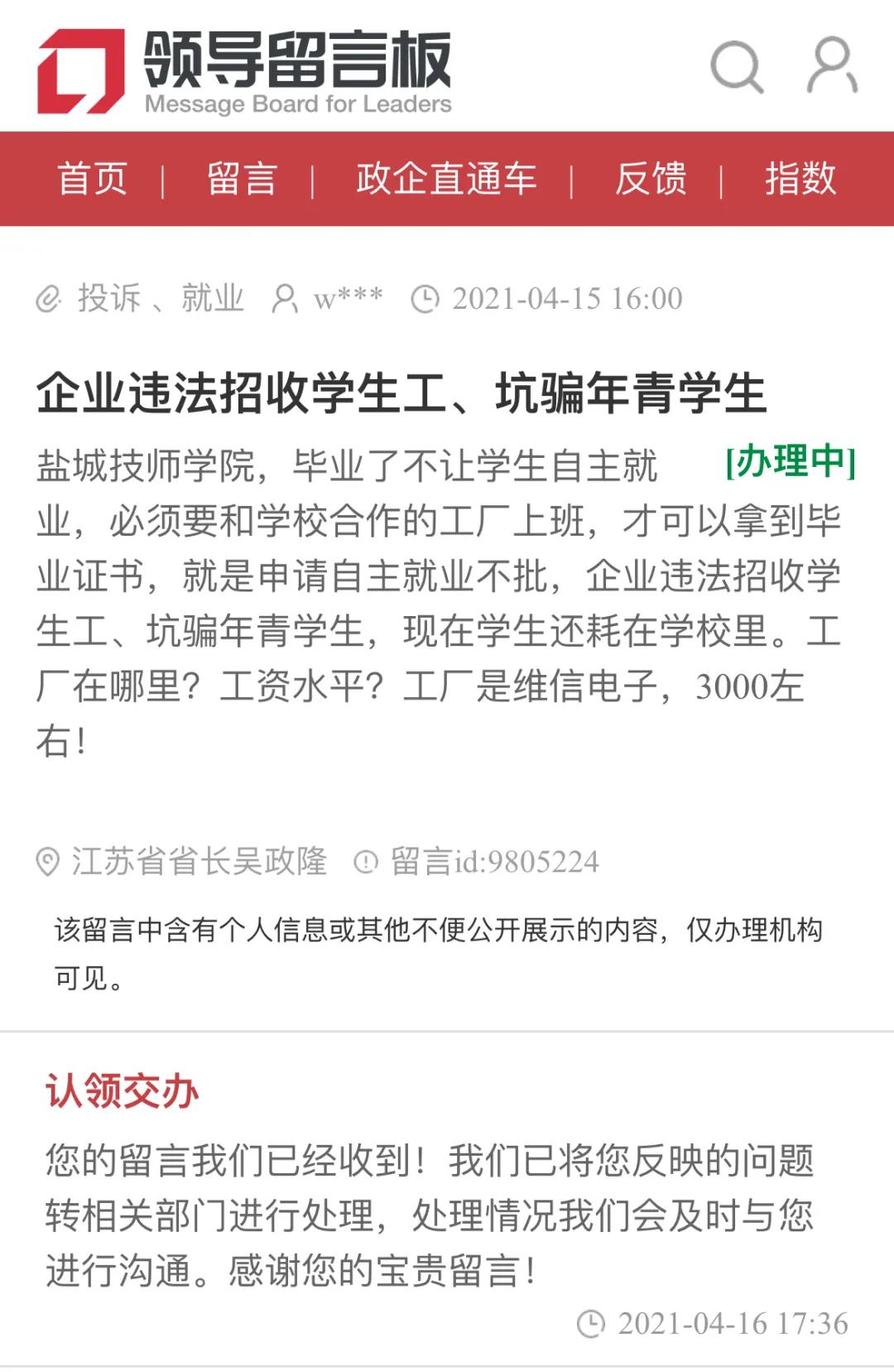 对于学生们的反映,江苏省盐城技师学院如何回应?有关事情进展,总台央广中国之声将持续关注。(总台记者/管昕、张佳琪)