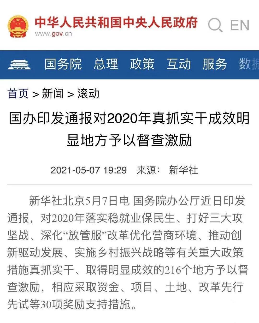 国务院办公厅近日印发通报,对2020年落实稳就业保民生、打好三大攻坚战、深化“放管服”改革优化营商环境、推动创新驱动发展、实施乡村振兴战略等有关重大政策措施真抓实干、取得明显成效的216个地方予以督查激励,相应采取资金、项目、土地、改革先行先试等30项奖励支持措施。