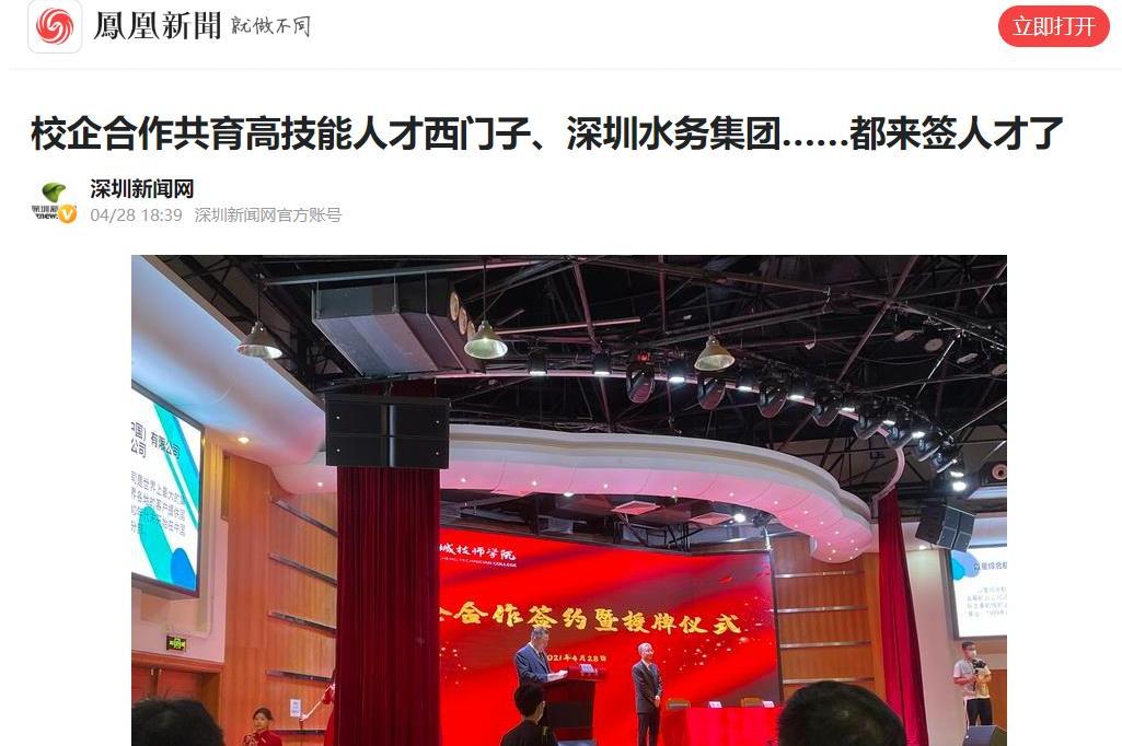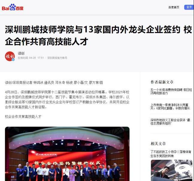 深圳鹏城技师学院2021年校企合作签约及授牌仪式在侨城校区礼堂举行,西门子、霍尼韦尔、深圳水务集团、海尔数字、以星综合航运等13家国内外行业龙头企业与深圳鹏城技师学院签订产教融合办学协议,共同开启校企合作共育高技能人才新征程。