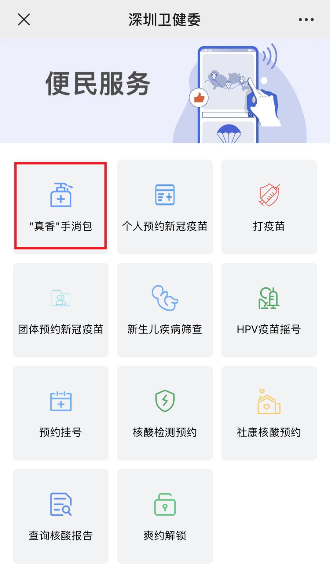 2. 点击菜单栏“便民服务-真香手消包预约”