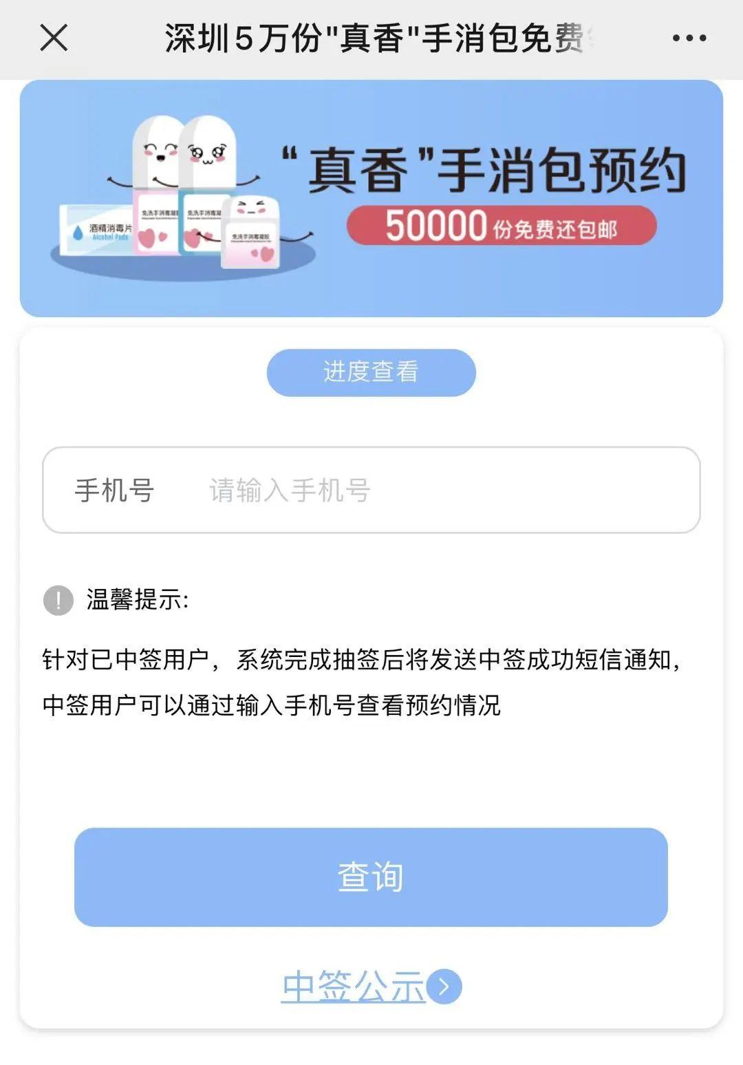 4. 登记成功后,市民可通过“深圳卫健委公众号-便民服务-真香手消包预约-进度查看”,输入个人登记信息查询中签信息和配送进度。
