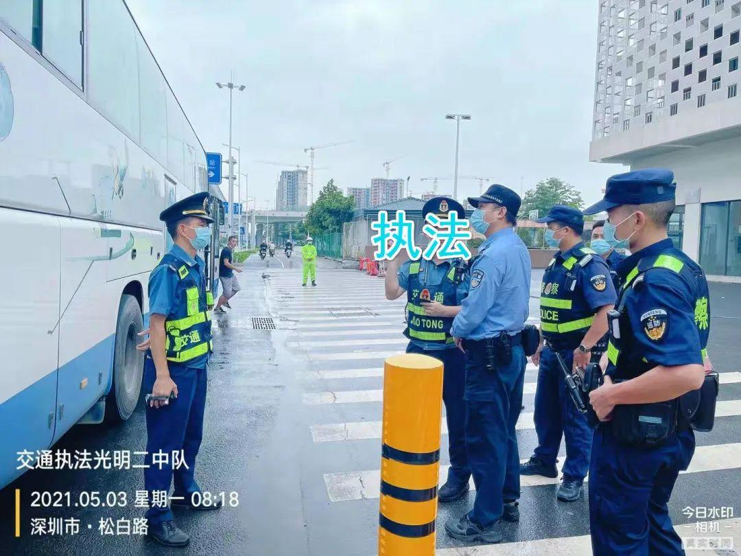 5月3日,执法支队光明大队在松白路公明西环大道路口处开展执法行动,检查过程中发现一辆粤W10***大客车形迹可疑。