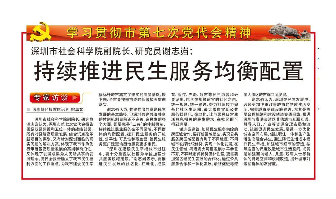 深圳市社会科学院副院长、研究员谢志岿在接受记者采访时认为,深圳市第七次党代会报告围绕“双区”建设和“五位一体”的战略部署,既有对经济高质量发展、综合试点改革新项目的谋划,又有针对深圳面临的现实问题的解决方案,体现了深圳作为先行示范区高质量发展的高端和前沿性,又体现了发展成果为人民所共享的发展理念。党代会报告确立了深圳民生福利方面的工作重点,为深圳建设民生幸福标杆城市奠定了坚实的制度基础。接下来,全市要按照市委的部署加强贯彻落实。