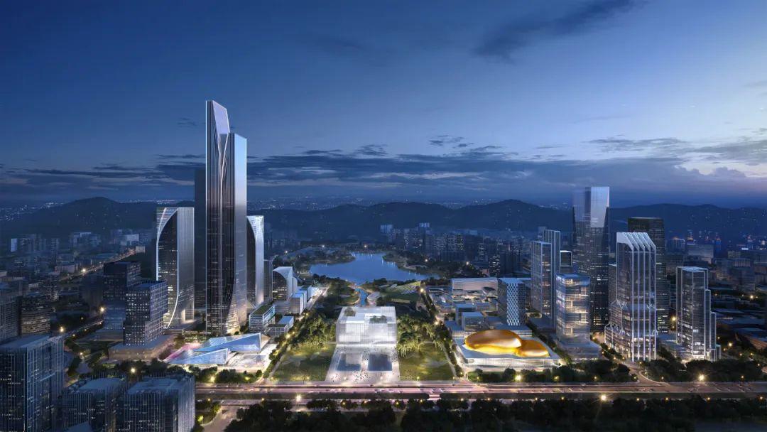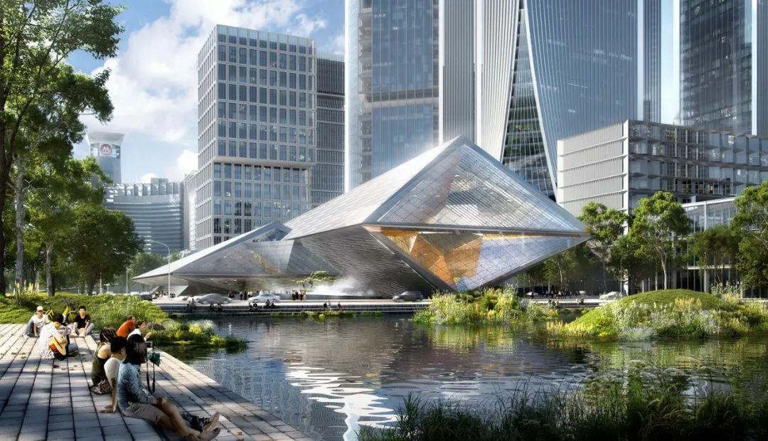 深圳金融文化中心:设计概念为“金石叠山”,既是镌刻深圳金融中心成长历程的“时代金石”,也用“叠山”意向传达“长久稳固”的金融业愿景。整个建筑突出表现了金融文化中心的地位。