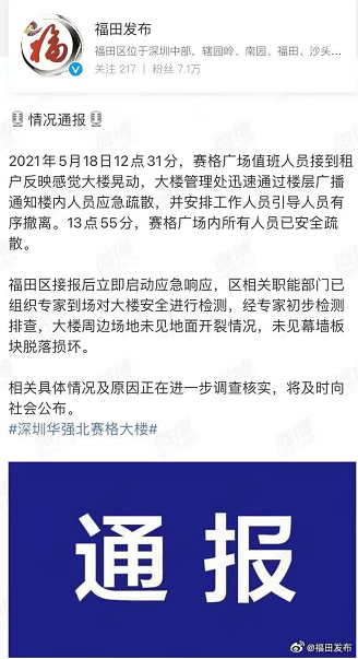 2021年5月18日12点31分,赛格广场值班人员接到租户反映感觉大楼晃动,大楼管理处迅速通过楼层广播通知楼内人员应急疏散,并安排工作人员引导人员有序撤离。13点55分,赛格广场内所有人员已安全疏散。