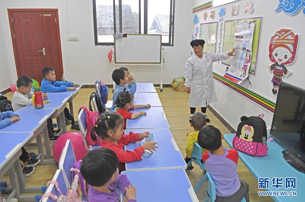 5月18日,在广西龙胜各族自治县龙脊镇小寨村,潘继萍教小朋友们如何防范手足口病。新华社记者周华摄