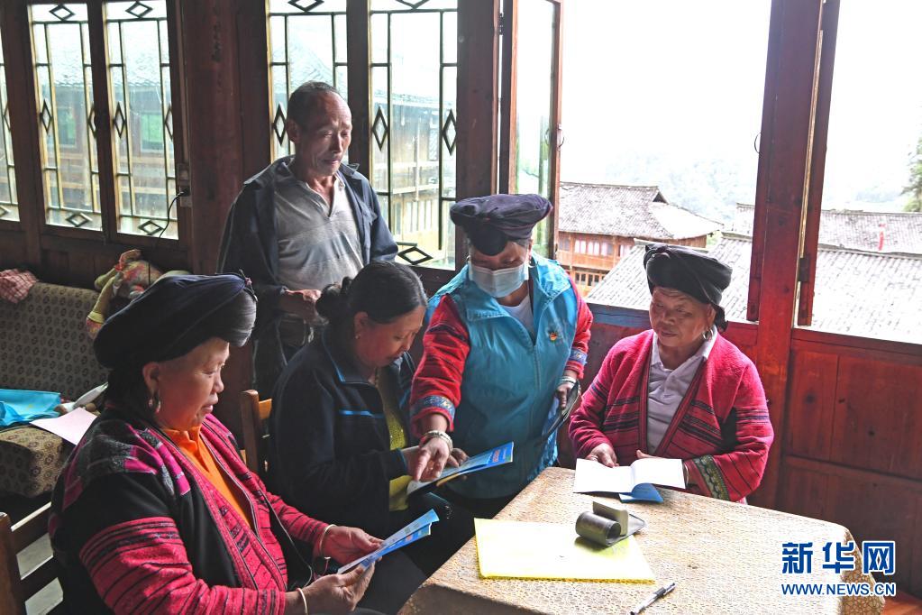 5月18日,在广西龙胜各族自治县龙脊镇小寨村,潘继萍(右二)上门宣传新冠肺炎防疫知识。新华社记者周华摄