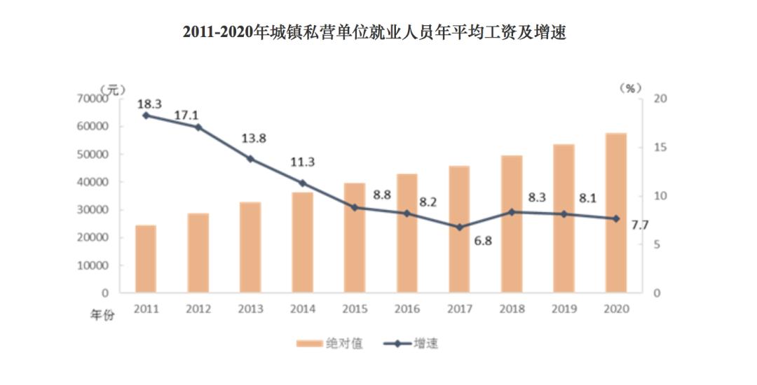 城镇私营单位就业人员年平均工资为57727元,比上年增加4123元,名义增长7.7%,增速比上年回落0.4个百分点,扣除价格因素实际增长5.3%。