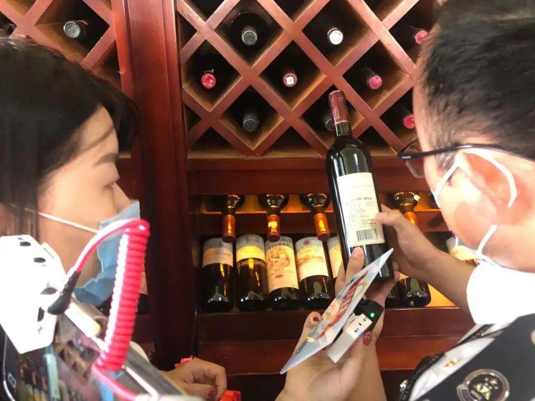 △执法人员随机查看一瓶法国进口红酒的生产日期和中文标签