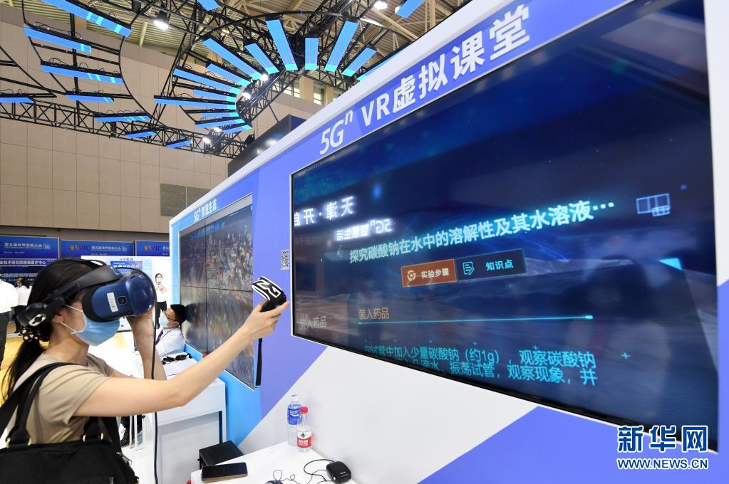 5月20日,在天津梅江会展中心,参观者在体验VR虚拟课堂。新华社记者赵子硕摄