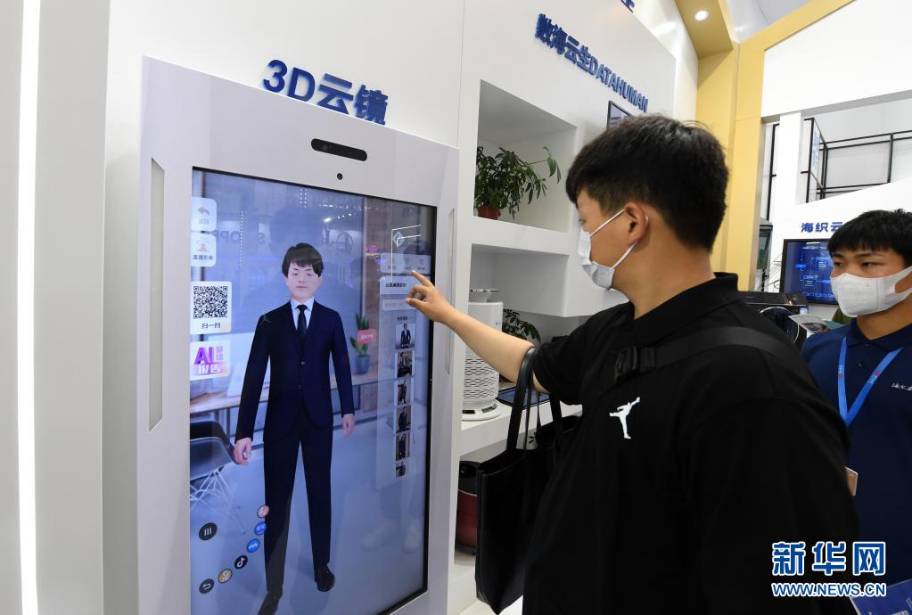 5月20日,在天津梅江会展中心,参观者在体验3D云镜。新华社记者赵子硕摄