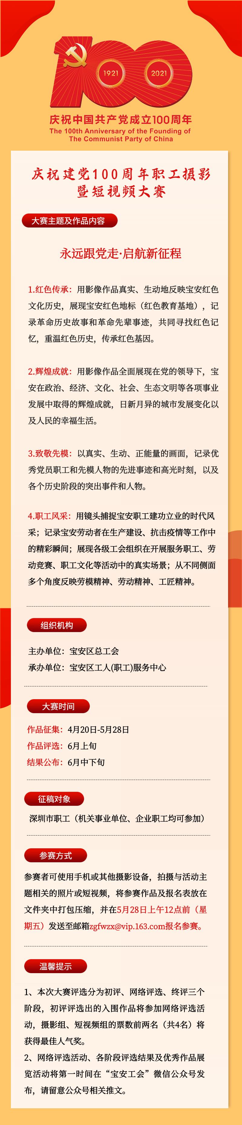 宝安区总工会为庆祝中国共产党建党100周年,团结激励全区职工在党的领导下为深圳“双区”建设作出新的更大贡献,庆祝建党100周年职工摄影暨短视频大赛开办啦!爱摄影的小伙伴看过来~