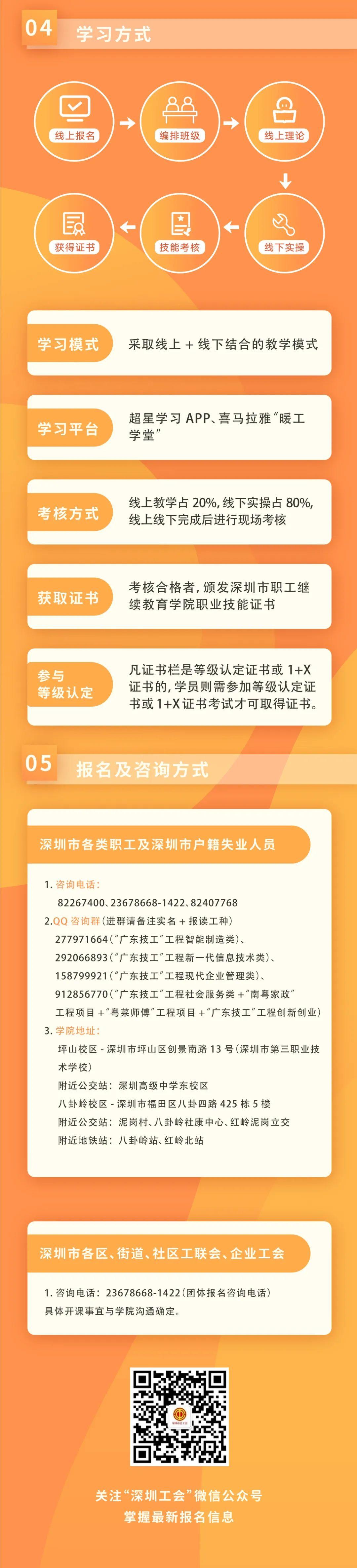 第14届“圆梦计划”技能培训采用线上教学+线下实操互动交流的教学方式,部分课程前期在超星学习平台APP、“暖工学堂”进行线上教学,后期根据线下开课时间在八卦岭校区和坪山校区(福田区八卦四路41号425栋4-5楼、坪山区创景南路13号)学习,具体线下开课时间待学校通知。