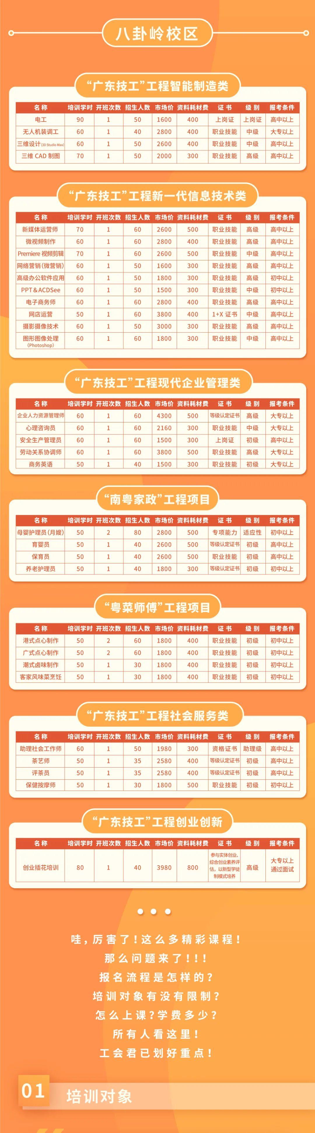 其中,公益性技能培训计划帮扶人数共5000人次。市总工会直接培训2000人,以我市各类职工,特别是优秀职工、基层一线职工、困难职工、失业人员为主要帮扶对象,提供智能制造类、信息技术类、企业管理类、社会服务类等几十门公益性职业技能培训并颁发相应证书(绝大部分课程学费由工会承担,职工仅需支付资料耗材费等)。