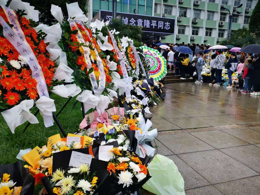 杂交水稻研究中心办公楼下的献花和悼念群众。澎湃新闻记者 谭君 图
