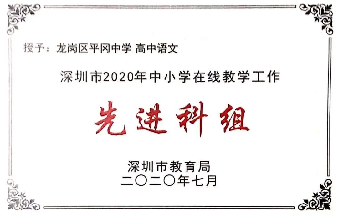 ★ 2020年,科组教师在疫情期间“停课不停学”的网课征集活动中,面向全国直播网课15节,其中高一年级《登高》一课获3万人收看。语文组入选市级教学资源库的课程数量也位居全市前列。在深圳市“在线教学先进单位和先进个人”评选活动中,荣获“高中先进科组”称号,为全市二个获此殊荣的语文科组之一。