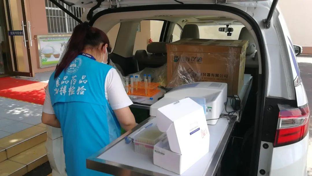 △“蓝马甲”现场对食堂后厨的4批次食品原材料进行抽检