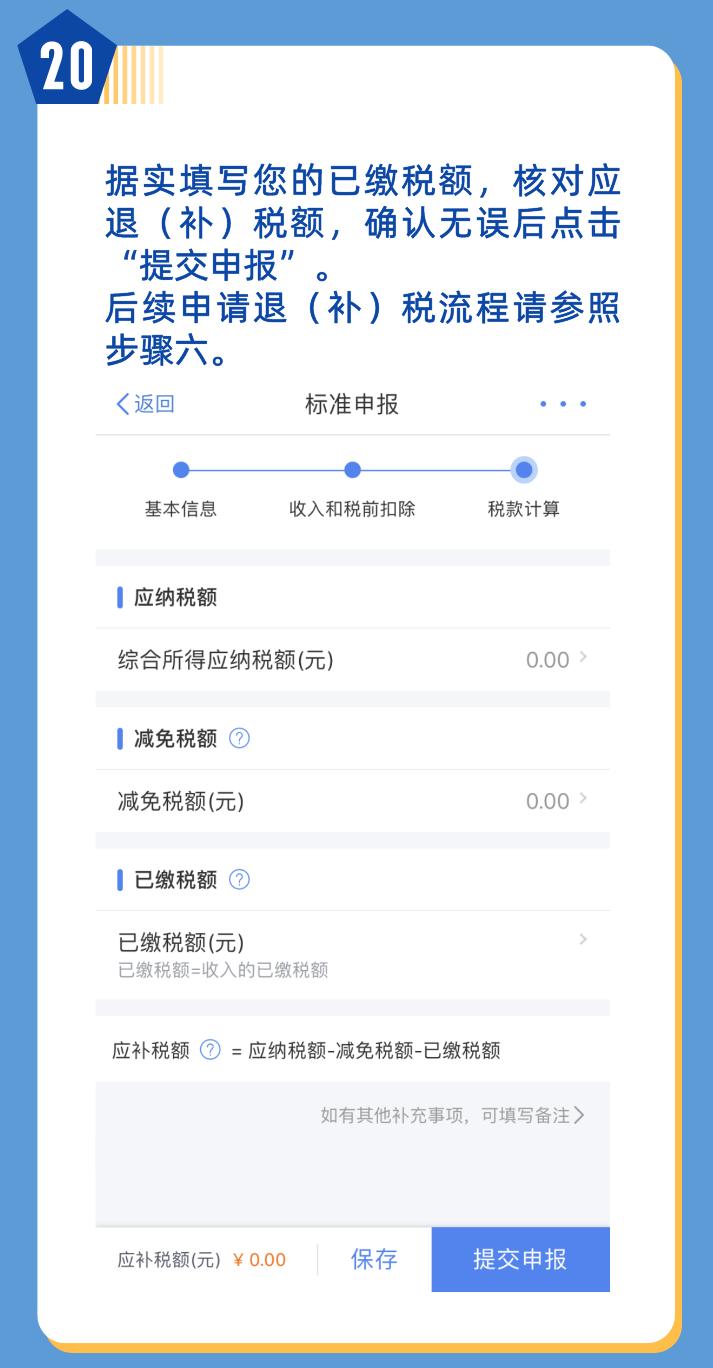 应退或应补税额=[(综合所得收入额-60000元-“三险一金”等专项扣除-子女教育等专项附加扣除-依法确定的其他扣除-捐赠)×适用税率-速算扣除数]-2020年已预缴税额