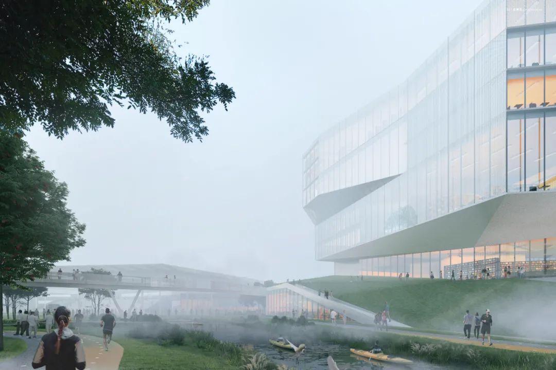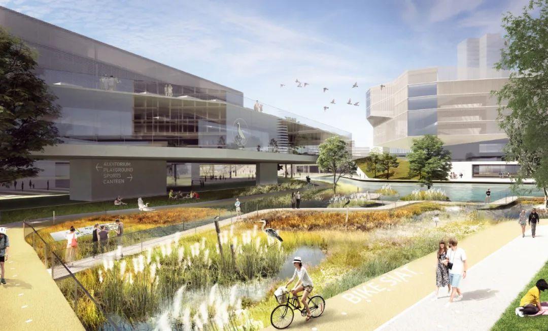 中央景观公园,城市与校园共享的生态基础设施,容纳校园中最为重要的公共建筑、学生的体育、休闲、自然体验等丰富的功能。水系也提供了行船、步道等慢行体系。