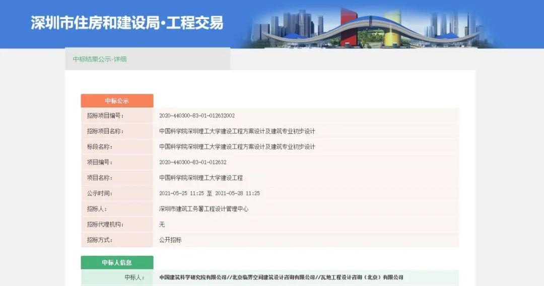 中国科学院深圳理工大学建设工程方案设计及建筑专业初步设计国际招标,于2021年5月25日公布中标结果,“中国建筑科学研究院有限公司//北京临界空间建筑设计咨询有限公司//瓦地工程设计咨询(北京)有限公司”联合体赢得这次竞标。