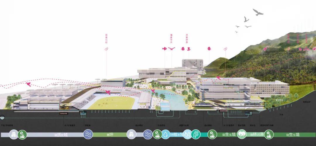 为构筑健康舒适、丰富体验感的校区景观,设计提出构筑“三境”的策略,海绵弹性的安全水境、多样栖息的修复生境、与自然美学的体验园境相互叠加,形成独属于中国科学院深圳理工大学校区特色的景观复合系统。