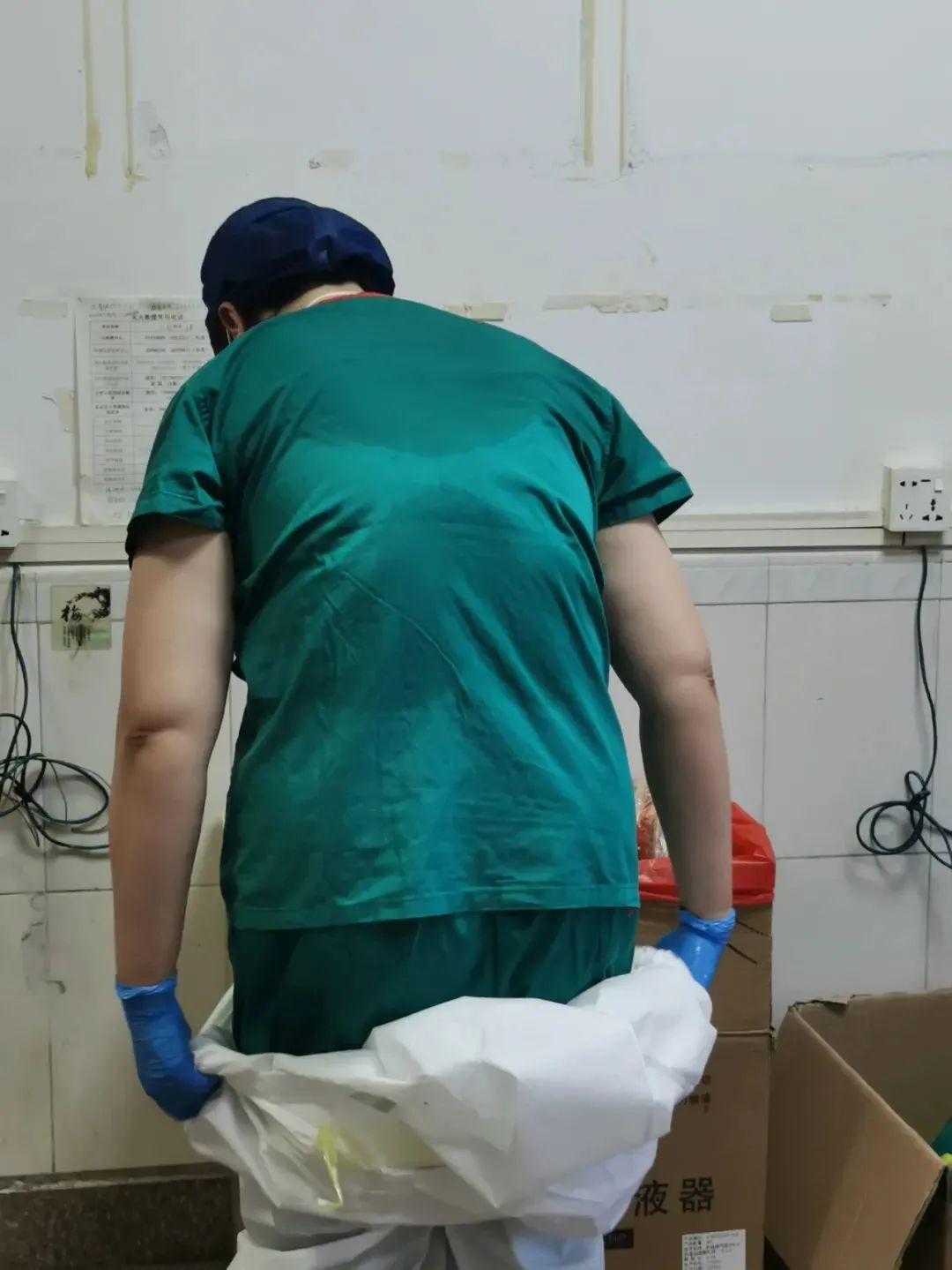 3点半左右,医护人员开始脱下防护服,准备收拾物资返回医院。防护服脱下后,只见蓝色的工作服已经全部湿透。
