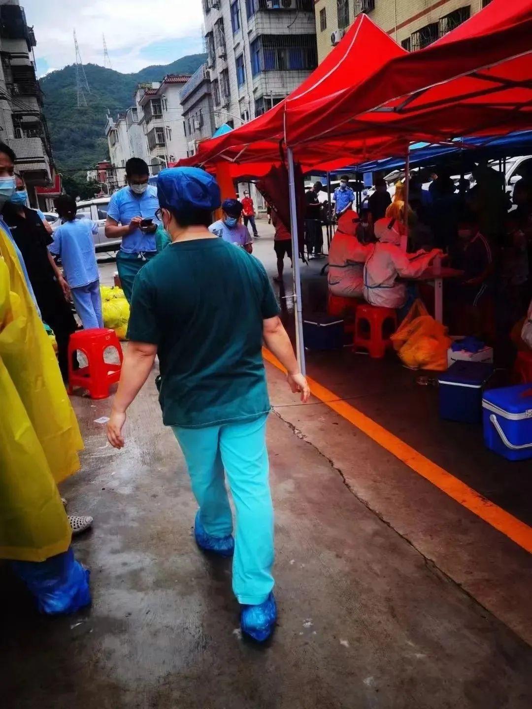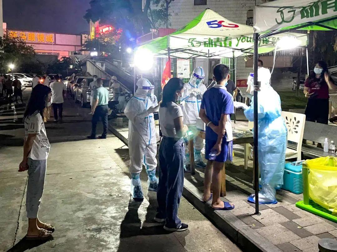 26日23:30,医院副院长莫蓓蓉带领两名做现场疏导的护士转场支援粤海街道的云海天城社区,采样点就设在大楼的门口。