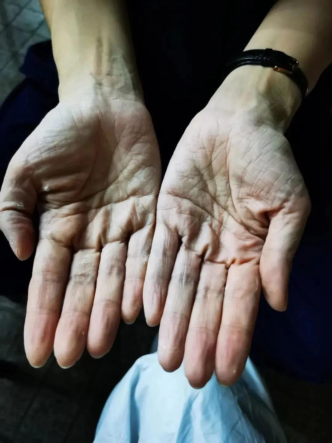 摘掉手套的双手被汗水泡肿……