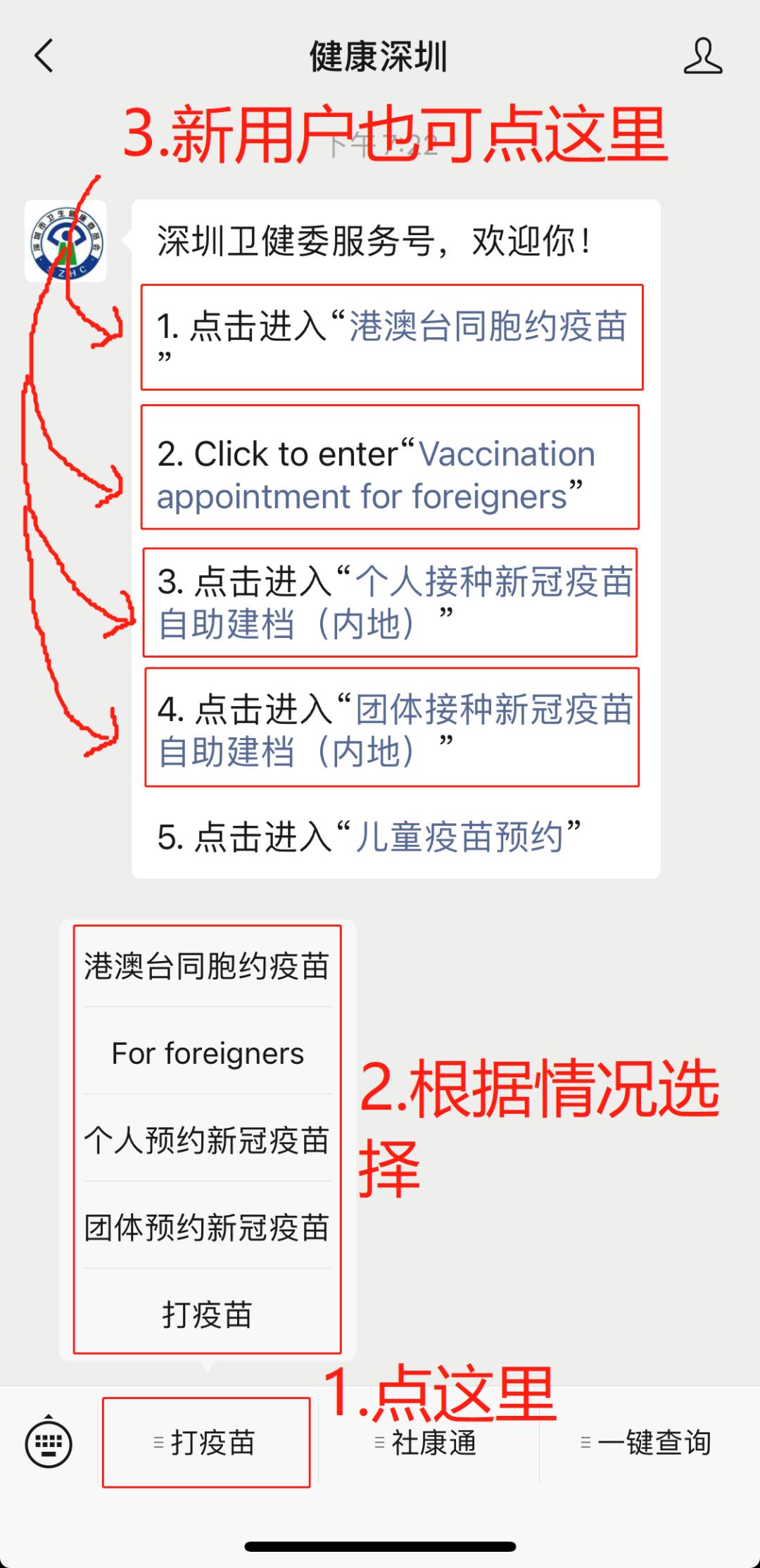港澳台同胞和外籍人士可以通过“健康深圳”微信公众号,进行网上自助建档和预约。