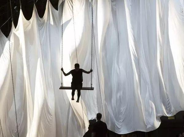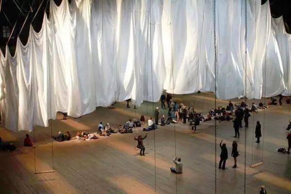 这是艺术家Hamiton在一个5万5千平方英尺的展区做的大型装置作品。白色的丝绸从天花板垂下,丝绸的顶端连接钢索,钢索衔接秋千,人们晃动秋千就会联动丝绸。白色的巨大丝绸就会在展厅里随着人秋千的不断晃动,持续飘舞。在这个装置内,人们做什么都是恰当的,人们的参与才使这个装置完整起来。
