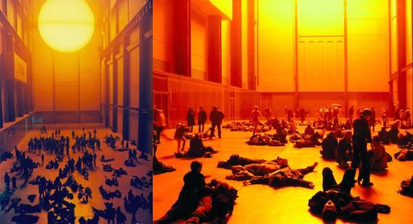 最有名的是在泰特美术馆的展区内用灯泡、镜子、湿度、颜色制造一种“海滩日落”的天气环境和景观。艺术家在展区不仅加大了空气湿度还融入了蜂蜜和糖调制的一种香气,让人更放松有度假的感觉
