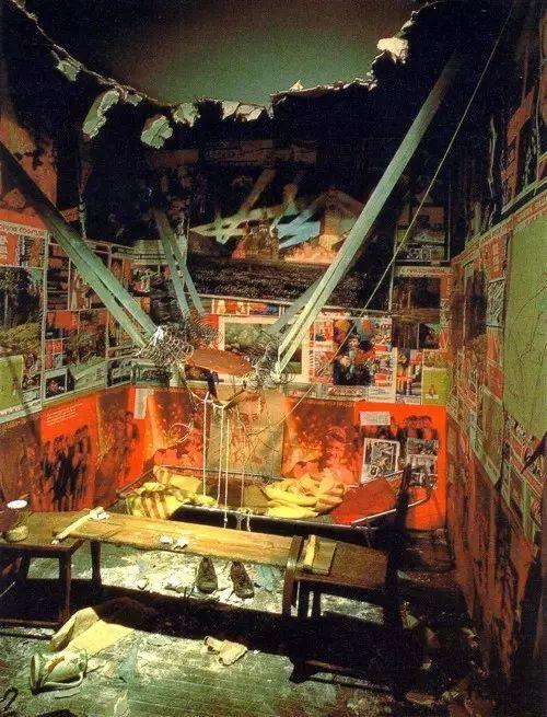 这是前苏联概念艺术家llya Kabakov 在1985年的作品《一个从自己公寓飞到外太空的男人》。可以看到,狭小的空间几乎没有家具,只有破烂的折叠弹簧床,好一条木板和两把椅子,一层又一层的国家意志海报和一堆关于飞行器的草图,这个环境一看就会联想到一个意向想上太空想疯了的人。