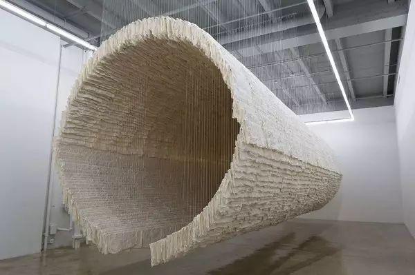 这是朱金石的《船》,是用一万张宣纸,每一张揉皱了以后,铺在竹棍上,最后做成了这样一个类似“隧道”的造型。