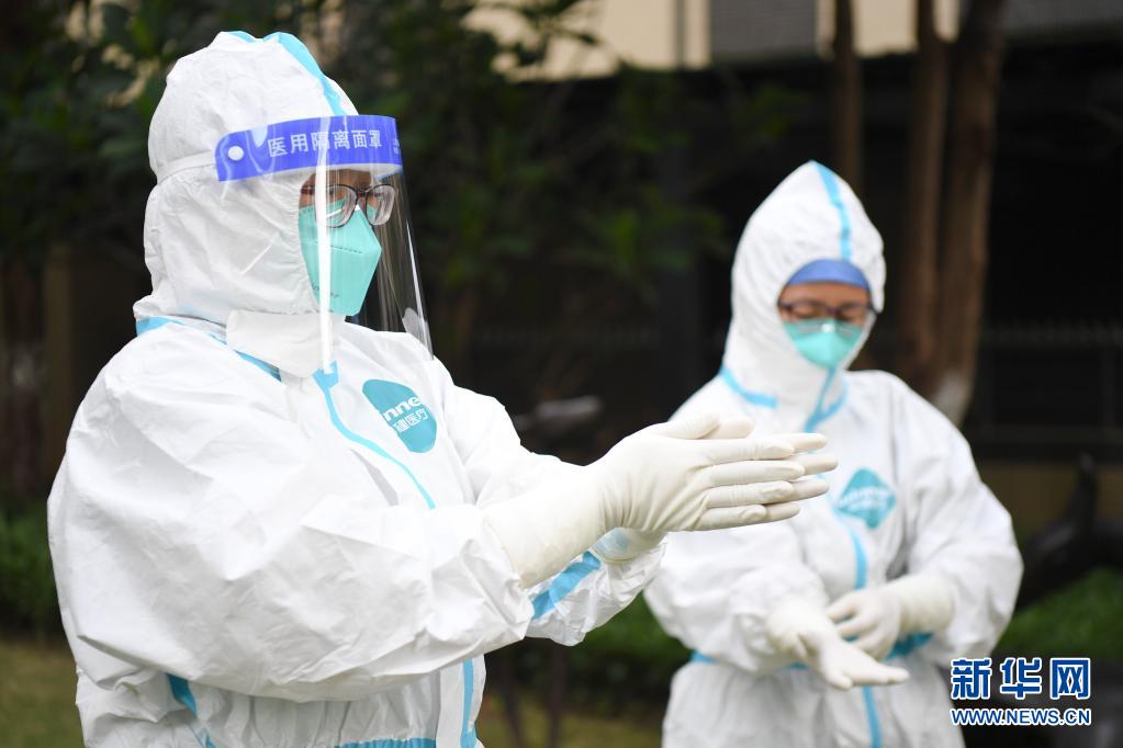 5月27日,在广州荔湾区白鹤洞街道一小区检测点,荔湾区骨伤科医院的医护人员在开始检测前检查防护装备。新华社记者邓华摄
