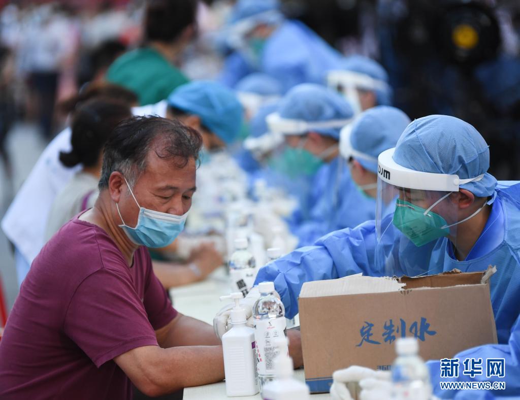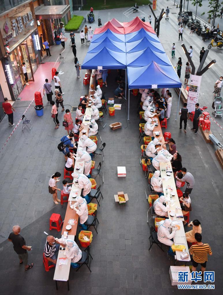 5月27日,在广州荔湾区广钢新城核酸临时采集点,南方医科大学南方医院的医务人员进行核酸检测采样。新华社记者邓华摄
