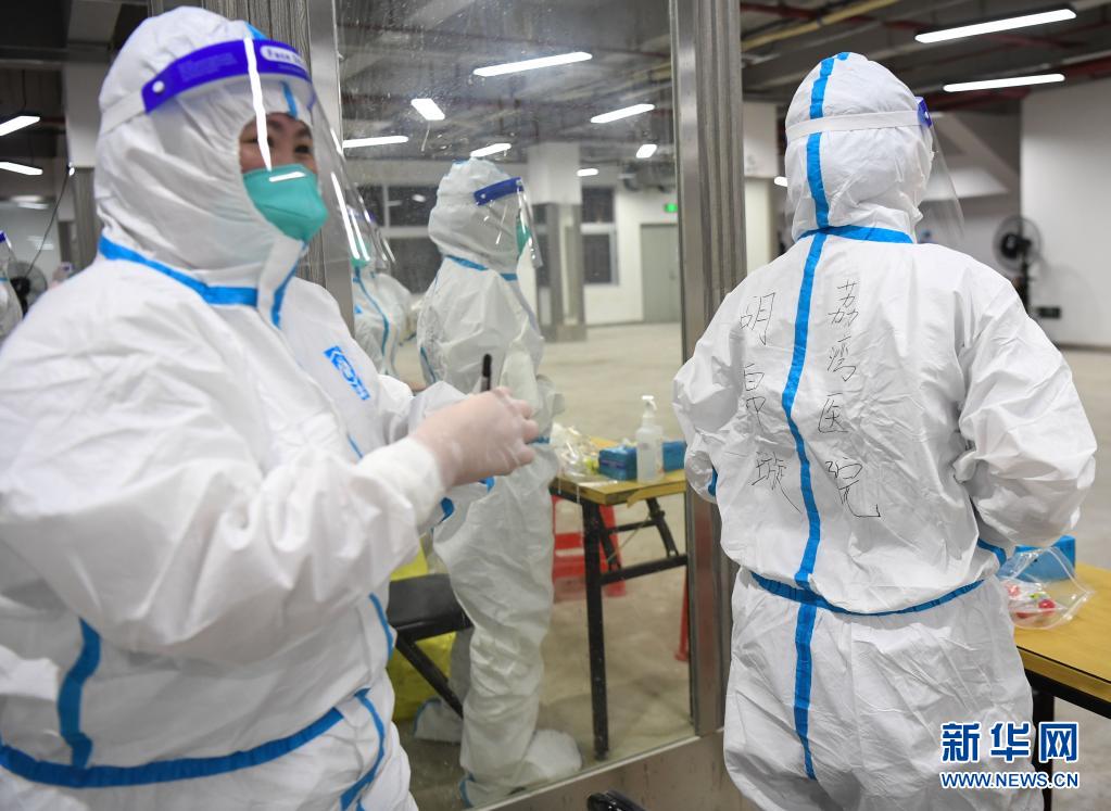 5月27日,在广州荔湾区白鹤洞街道一小区检测点,荔湾区骨伤科医院的医护人员在开始检测前检查防护装备。新华社记者邓华摄