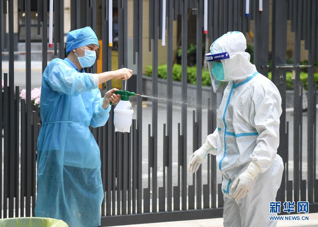 5月27日,在广州荔湾区白鹤洞街道一小区检测点,荔湾区骨伤科医院的医护人员给换班下来的同事喷洒消毒液。新华社记者邓华摄