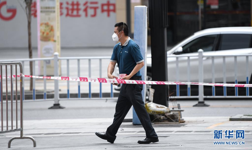 5月29日,在被纳入最严管控范围的广州荔湾区白鹤洞街道广钢新城,物业工作人员拉起安全警戒线。新华社记者邓华摄