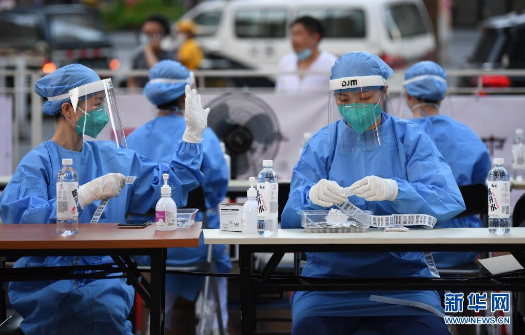 5月27日,在广州荔湾区广钢新城核酸临时采集点,南方医科大学南方医院的医务人员进行检测前的准备工作。新华社记者邓华摄