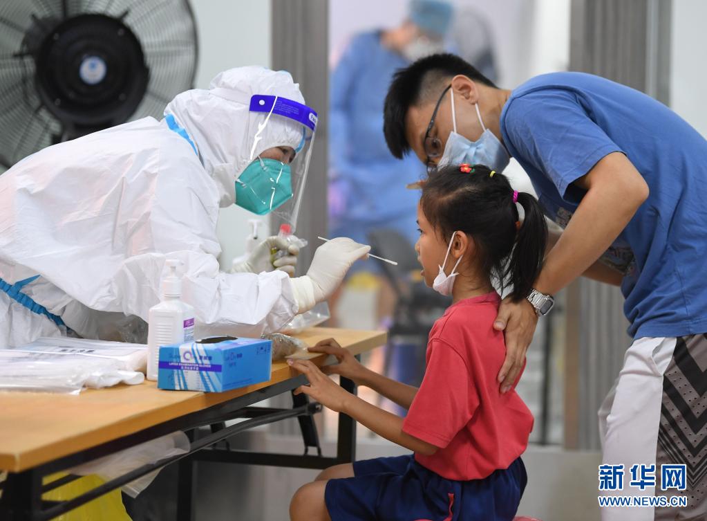 5月26日,在广州荔湾体育馆核酸检测点,小朋友在家人的陪伴下进行核酸检测采样。新华社记者邓华摄