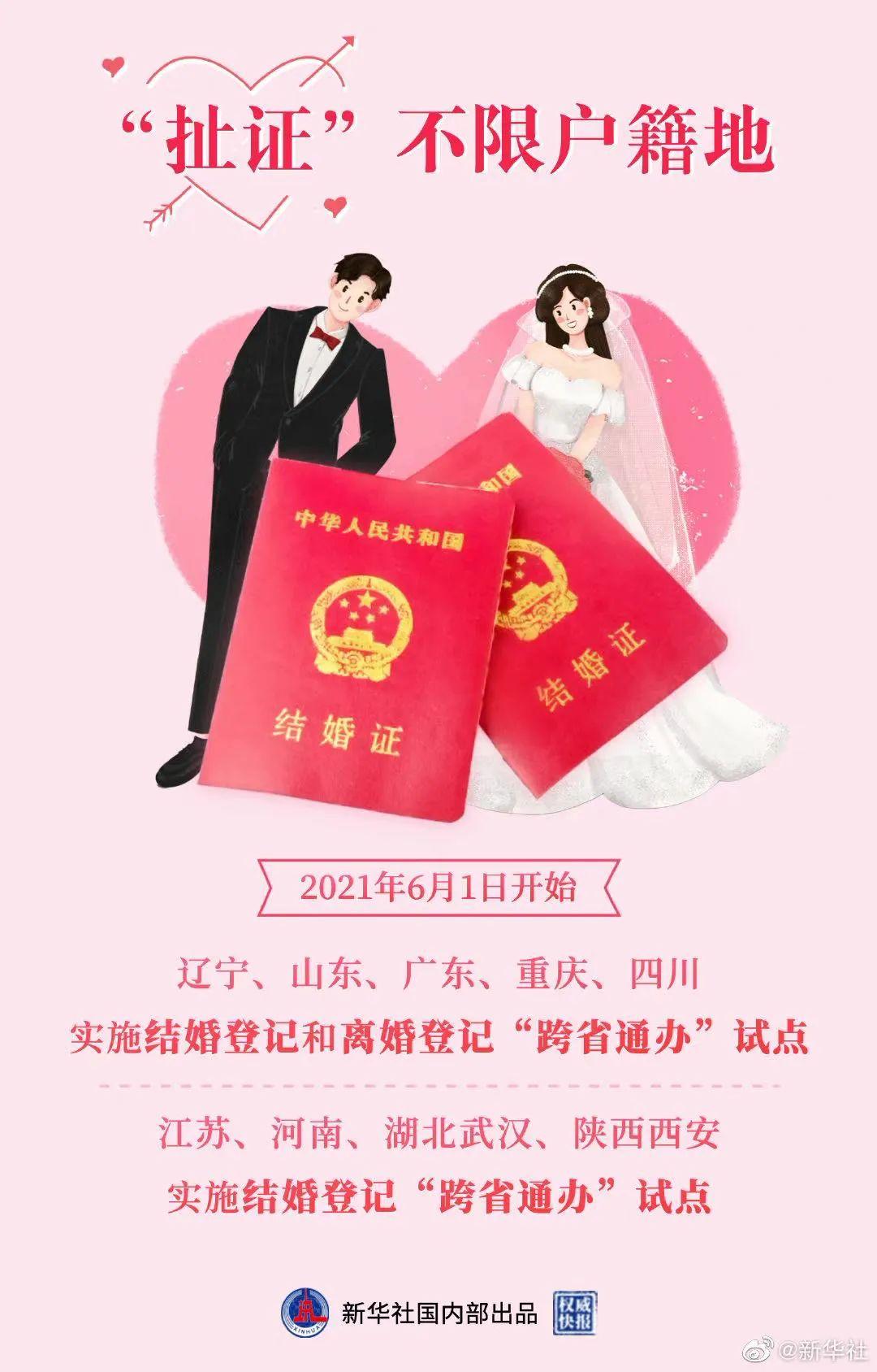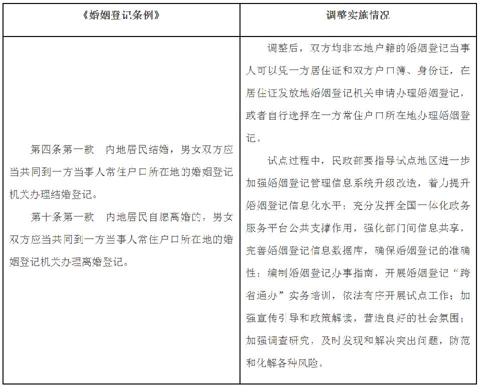 为加快推进政务服务“跨省通办”,满足群众在非户籍地办理婚姻登记的需求,推进婚姻登记制度改革,增强人民群众获得感、幸福感,同意在辽宁省、山东省、广东省、重庆市、四川省实施结婚登记和离婚登记“跨省通办”试点,在江苏省、河南省、湖北省武汉市、陕西省西安市实施结婚登记“跨省通办”试点。在试点地区,相应暂时调整实施《婚姻登记条例》第四条第一款、第十条第一款的有关规定(目录附后)。调整后,双方均非本地户籍的婚姻登记当事人可以凭一方居住证和双方户口簿、身份证,在居住证发放地婚姻登记机关申请办理婚姻登记,或者自行选择在一方常住户口所在地办理婚姻登记。试点期限为2年,自2021年6月1日起至2023年5月31日止。