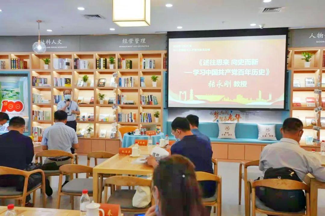 华南师范大学马克思主义学院教授张永刚以《述往思来 向史而新——学习中国共产党百年历史》为主题为学员作专题授课。张教授从党史学习教育“为何学、学什么和怎么学”三个问题入手,通过开天辟地—救国大业、改天换地—兴国大业、翻天覆地—富国大业、惊天动地—强国大业四个篇章,用通俗易懂的语言、生动活泼的案例,向学员讲述了中国共产党百年党史的主题主线。此外,通过当今社会的热点现象、多元冲突和治理难题分析,讲解了全面加强党的领导,动员凝聚各方力量等内容,进一步增强人才的道路自信、理论自信、制度自信、文化自信。