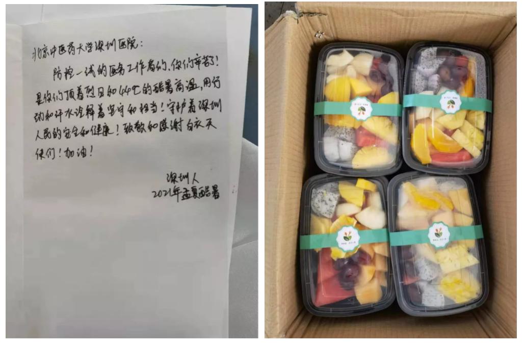 这封手写的感谢信和两大箱水果,被送到了龙岗区安良七村核酸检测点。